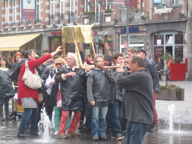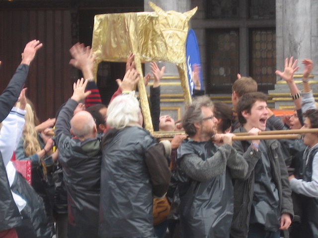 Après la procession historique de Tournai, ce 15 septembre 2013 en matinée, l’adoration du Veau d’Or, s’est déroulée l’après-midi sur la grand place de Tournai. Pour rappeler qu’il y a 5 ans, avec la faillite de la banque Lehmans brother, commençait la crise financière et pour beaucoup de personnes, le plongeon dans la précarité et la pauvreté.