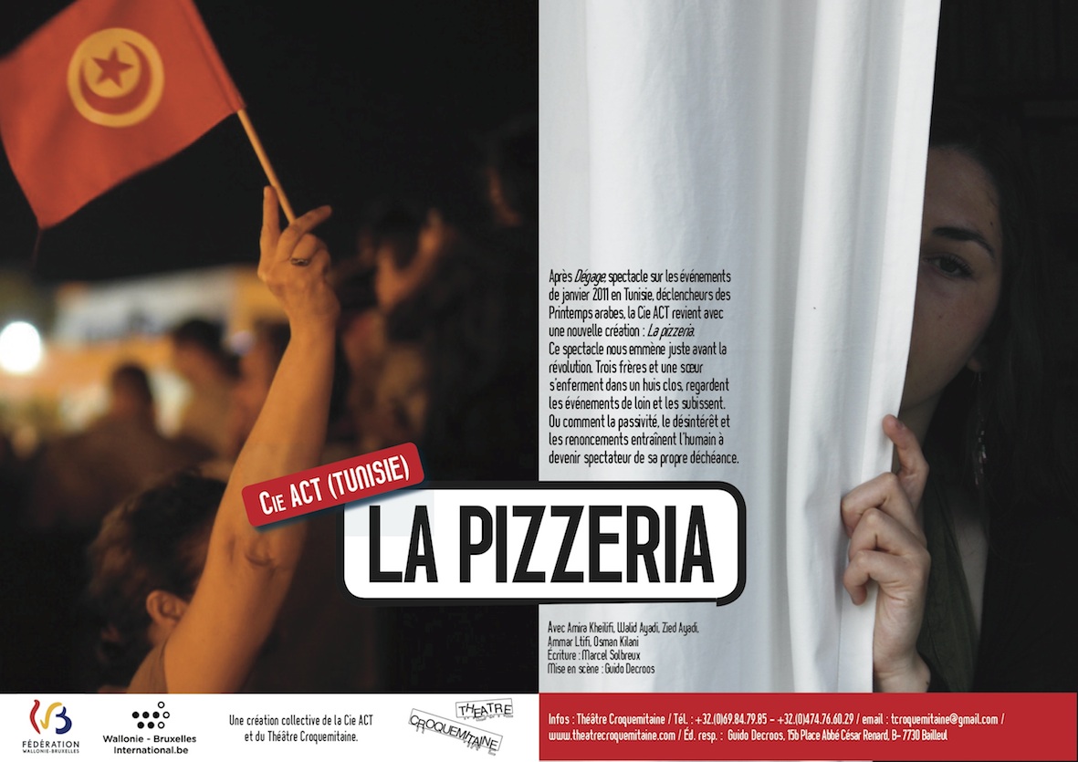 La Pizzeria est un spectacle qui nous invite au coeur d’une famille, à Tunis. Le père est à l’agonie. Les enfants pensent déjà à l’héritage. Le vieux décède, ils découvrent que tout est hypothéqué. Leur héritage : des dettes. L’aîné propose à la fratrie un plan de relance. Ils vont investir et transformer le restaurant familial en une pizzeria. Cette création collective, de la compagnie ACT’ et du Théâtre Croquemitaine, est une allégorie de la Tunisie.